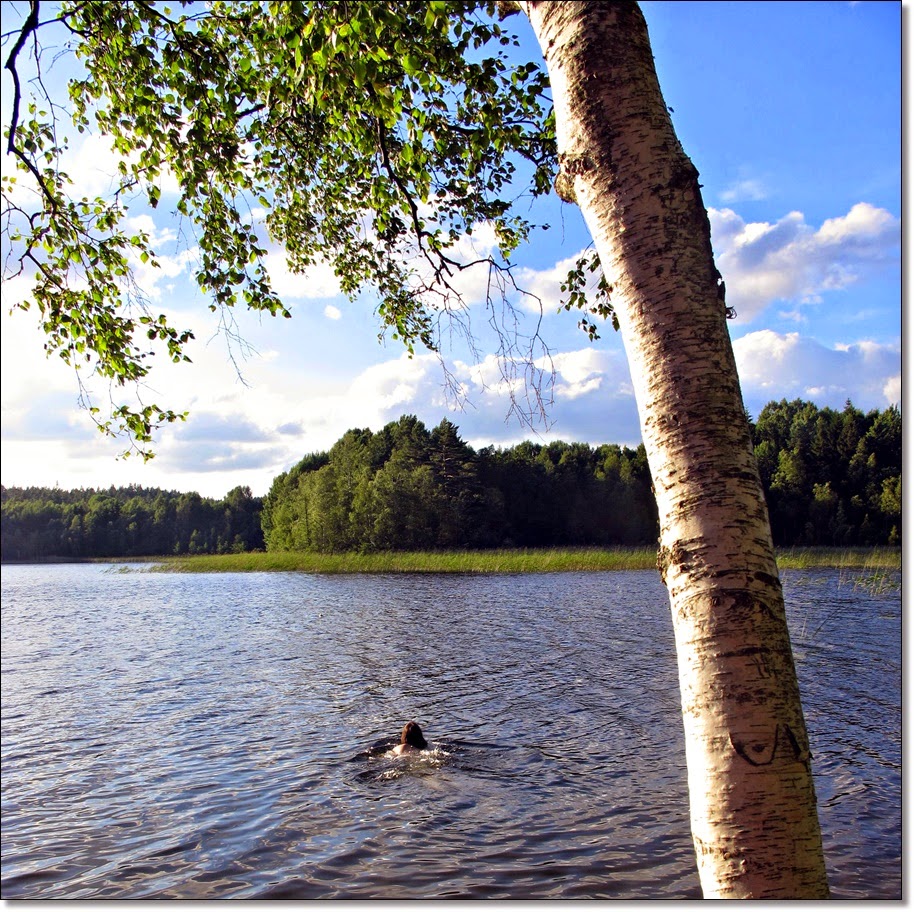 Vi har en liten sjö med kvällssol. Där tar vi oss ett svalkande kvällsdopp.