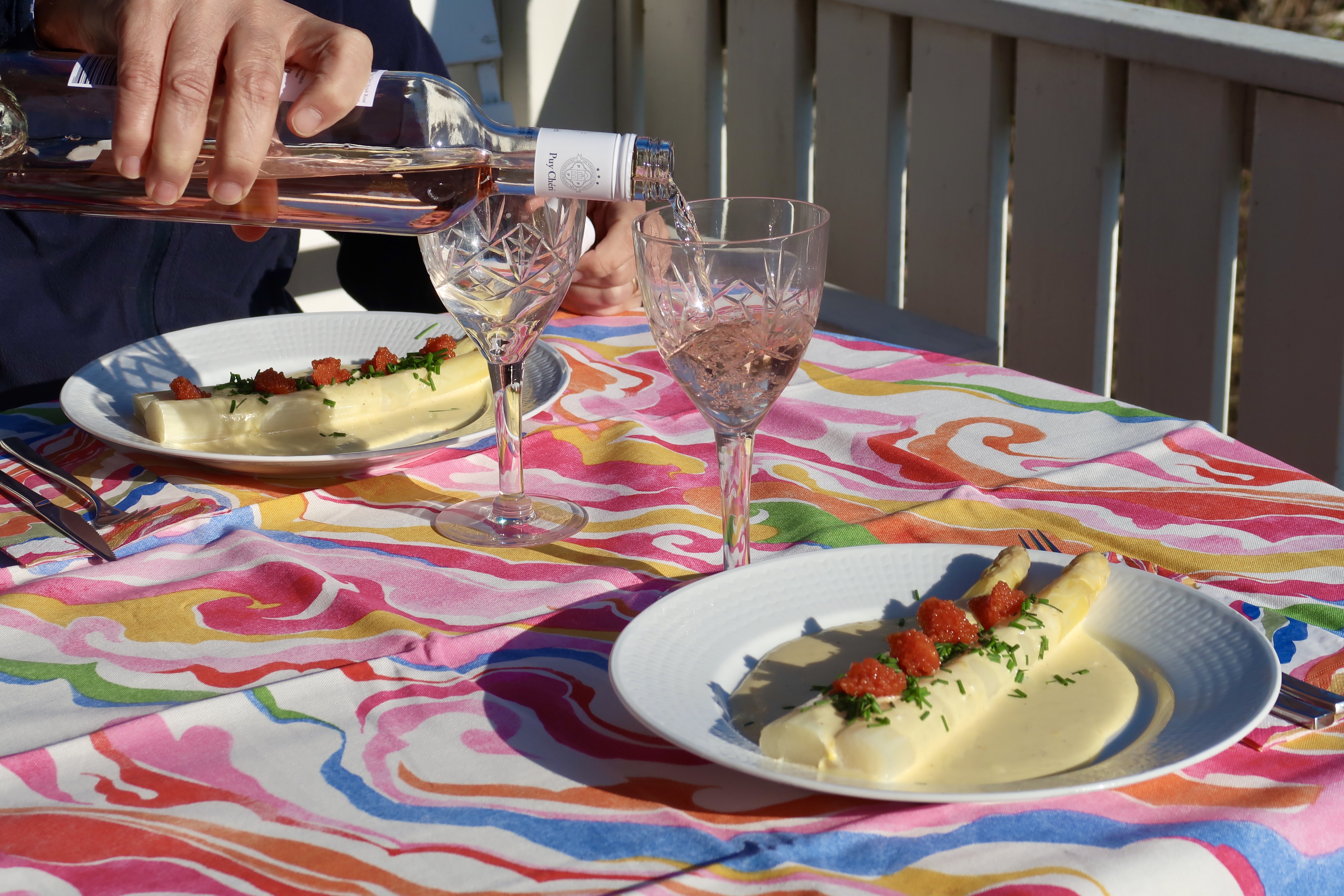 Dressa sparrisen med mousselinsås och toppa med rom och gräslök.