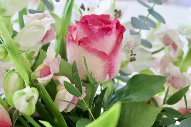 Så fin bukett och så fint med det gröna till. Förra veckan hittade jag just en polkagrisros i kruka och planterade den hos dottern med några andra blommor i en stor trädgårdskruka. Trodde på vårankomst😉men tror den klarat sig.