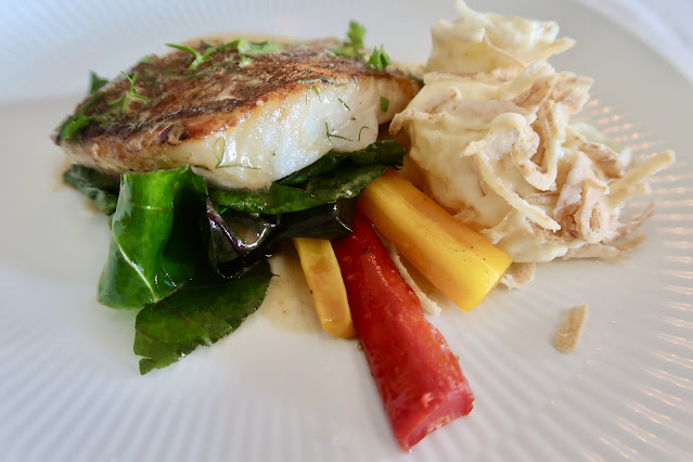 Grillad gös, morötter i glada färger, mangold, amadinepotatisgratäng i örtsmör med friterad lök.