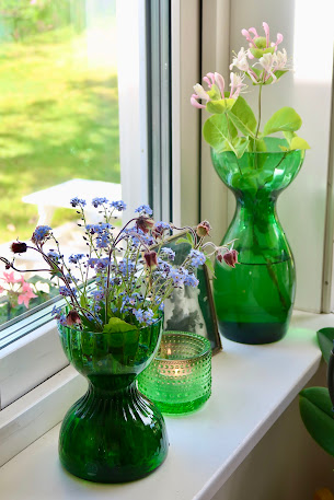 Jag har tänt ett ljus och plockat förgätmigej, humleblomster och kaprifol till minne av henne.